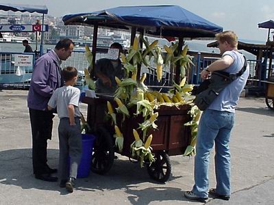 Along the river are many stalls selling freshly roasted or boiled sweet corn. This seller has used several cobs to decorate his stall.